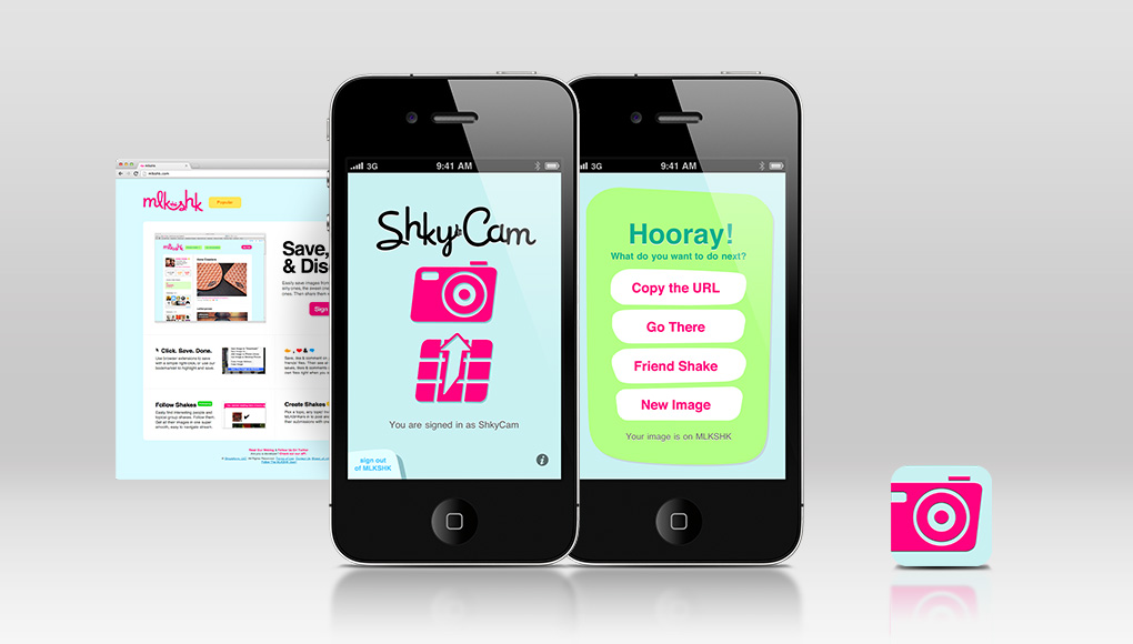 < Previous exampleI designed and developed ShkyCam, the first iOS app to connect to mlkshk.com. Software development was new to me, as were Objective-C, JSON, and OAuth2. For the logotype I wanted to echo the friendly smile in the mlkshk identity. Next example >